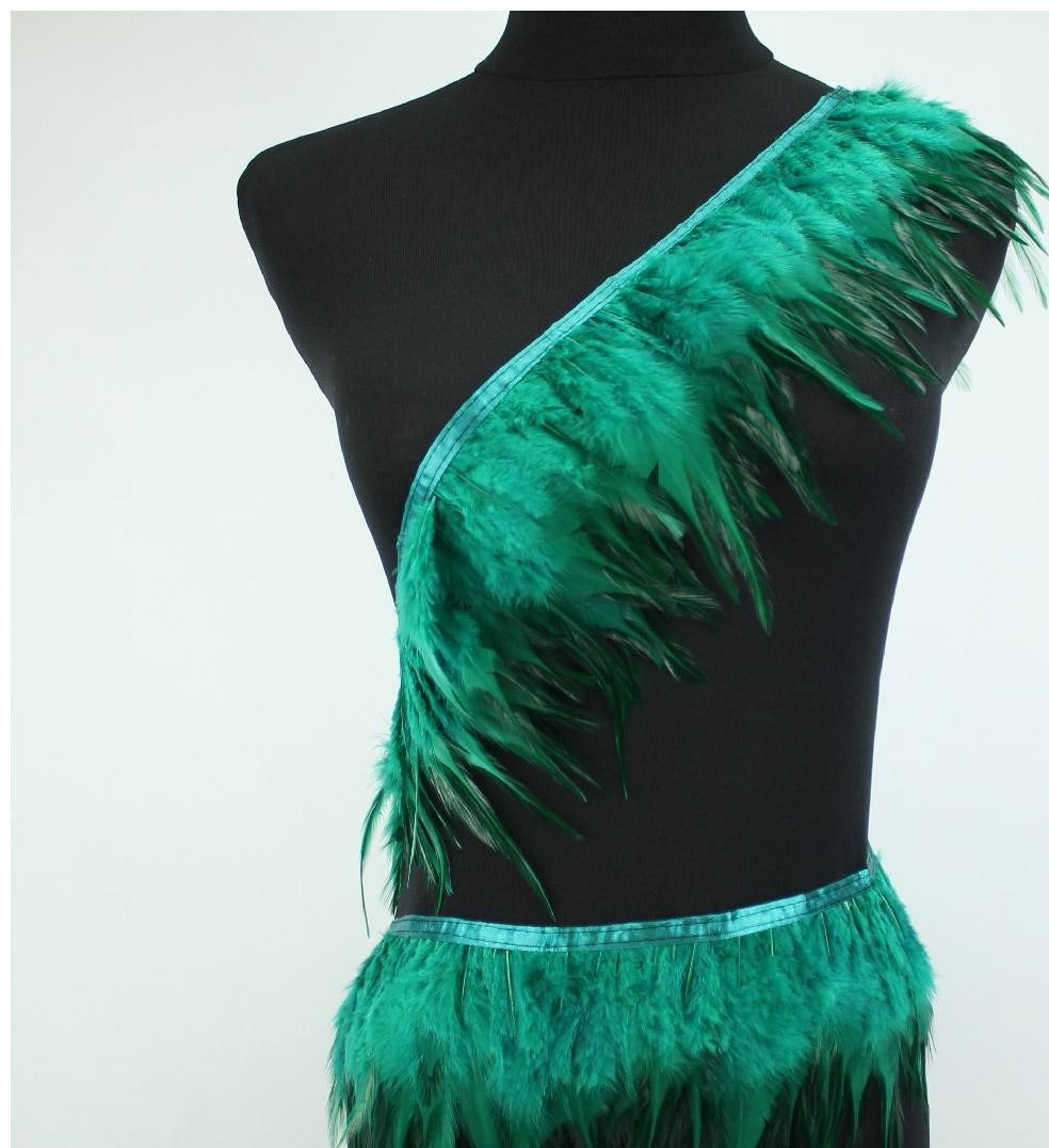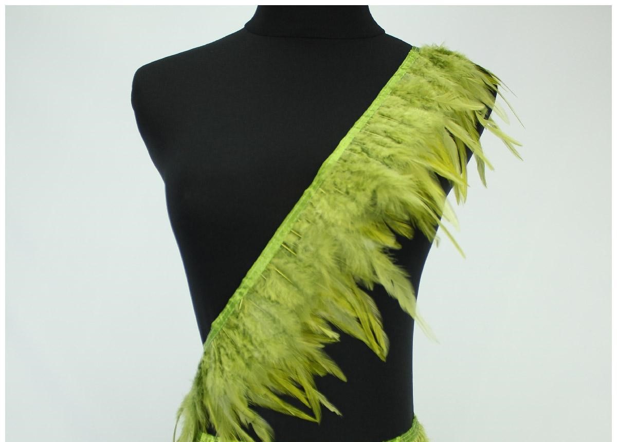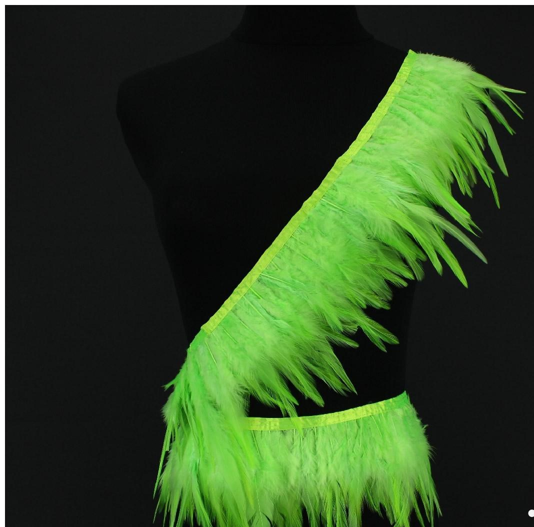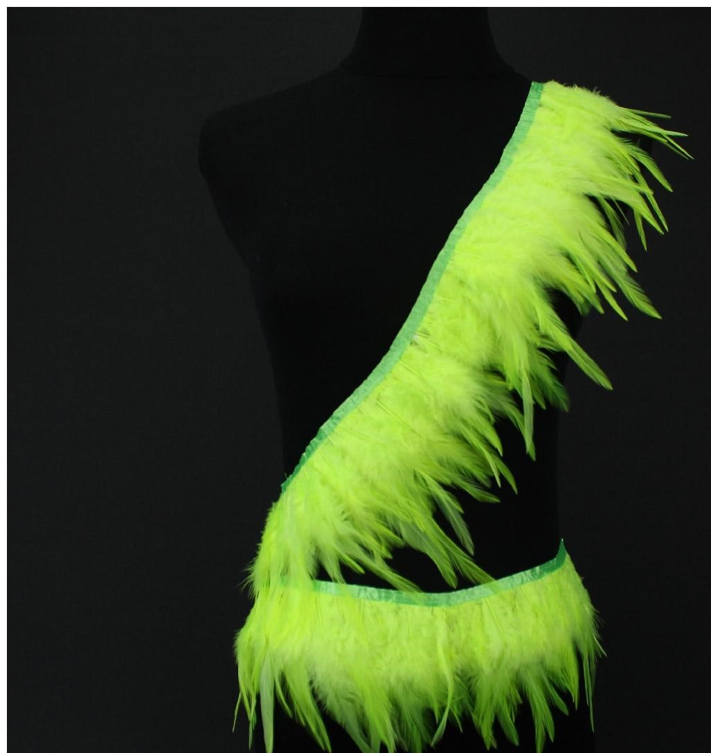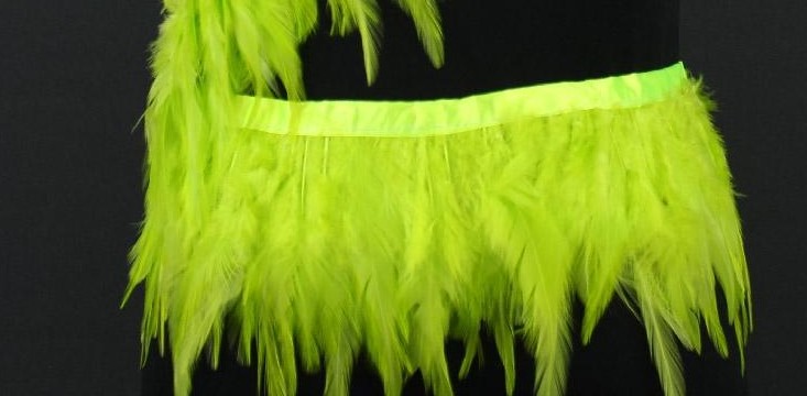 Vestido ou saia feita de penas verdes fluorescentes com fita cintilante