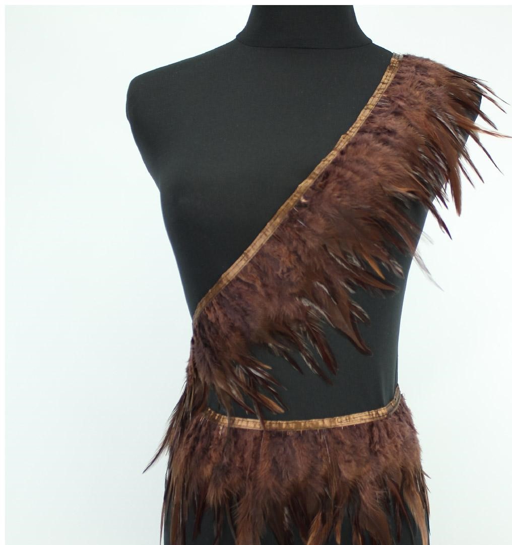 Acessório de penas castanhas sobre tecido preto num manequim