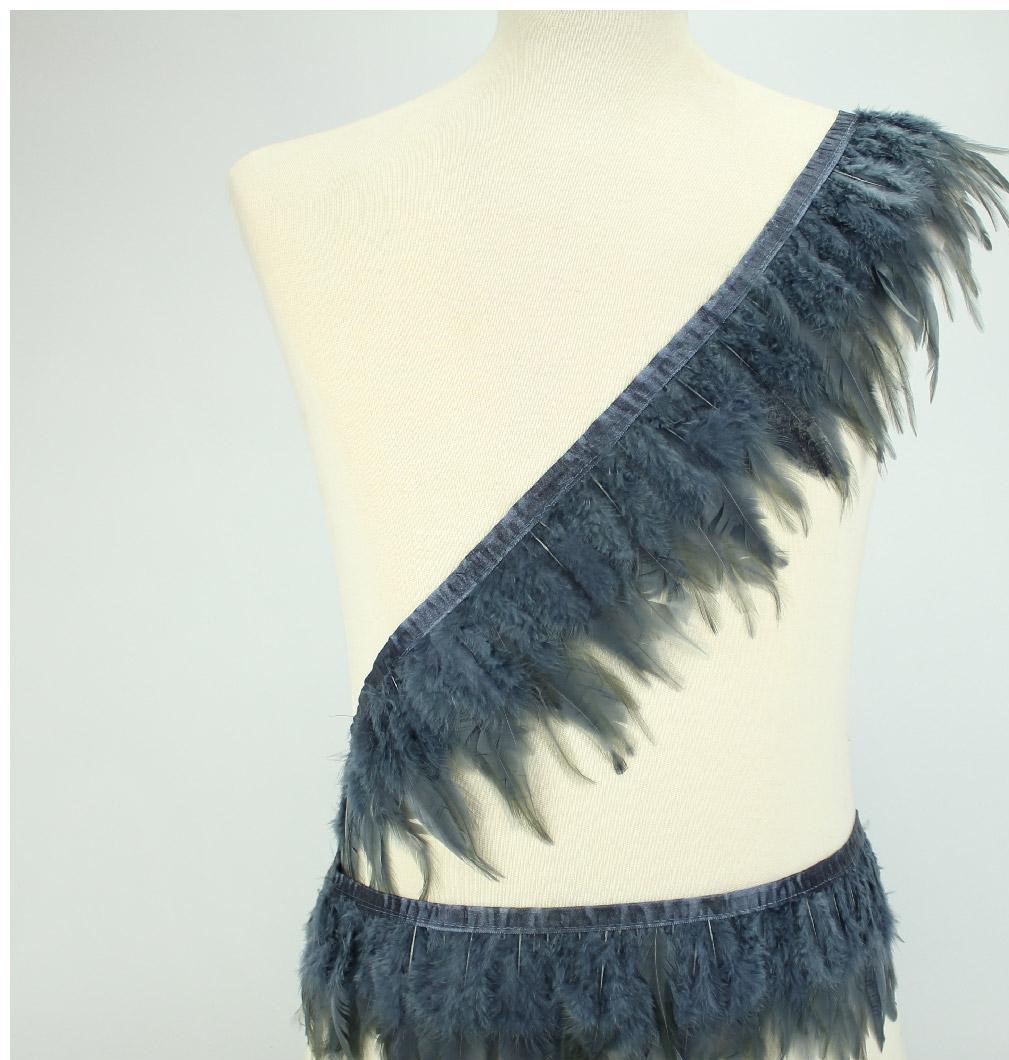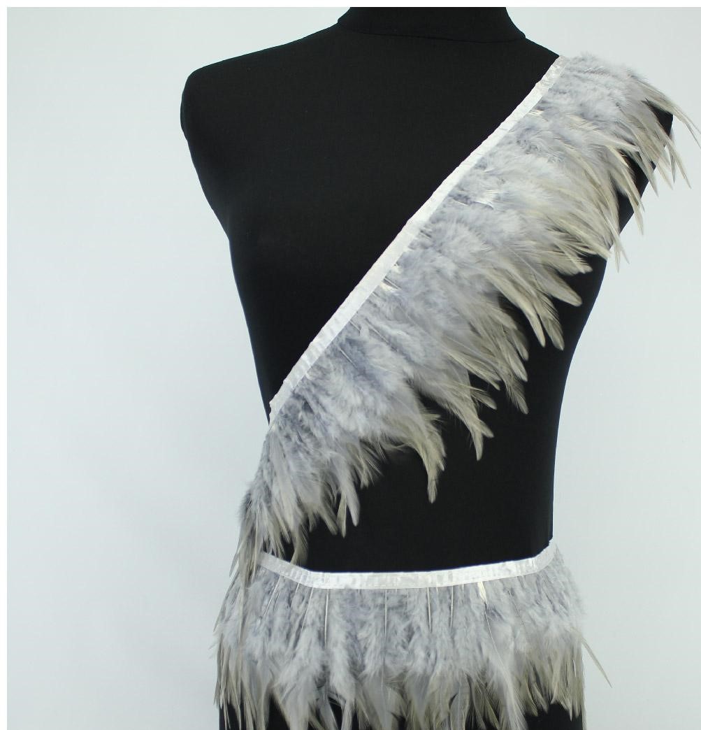 Fita decorativa com penas cinza e brancas num manequim preto
