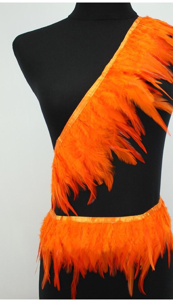 Faixas decorativas de penas laranja num manequim preto