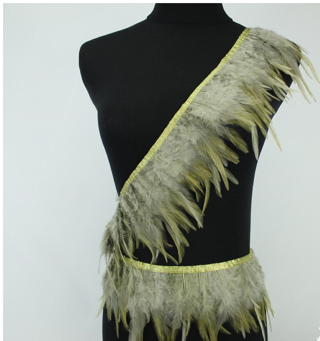 Faixa decorativa com penas cinzentas e amarelas num manequim preto
