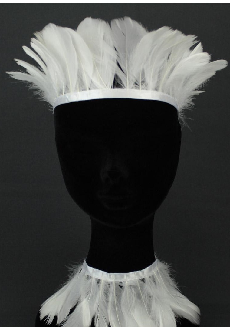 Adereços de penas brancas em manequim preto