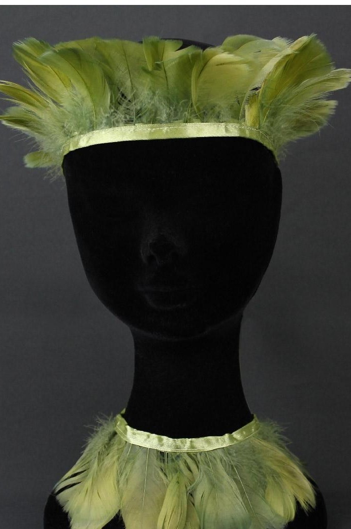 Conjunto de adereços com penas verdes em manequim preto