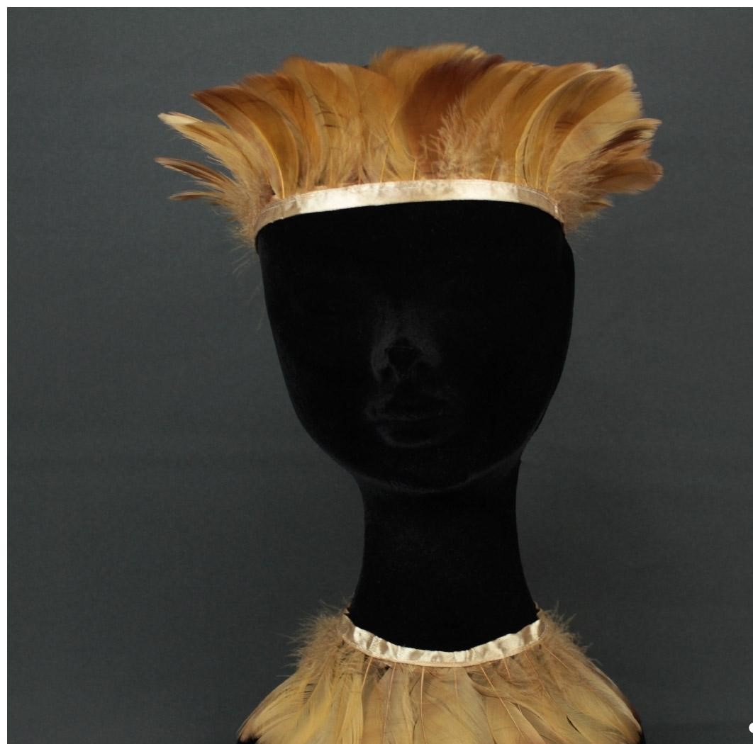 Tocado e colar de penas douradas em manequim preto