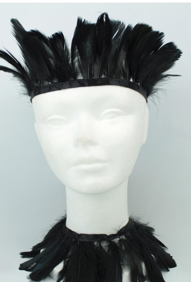 Manequim com coroa e colar de penas pretas