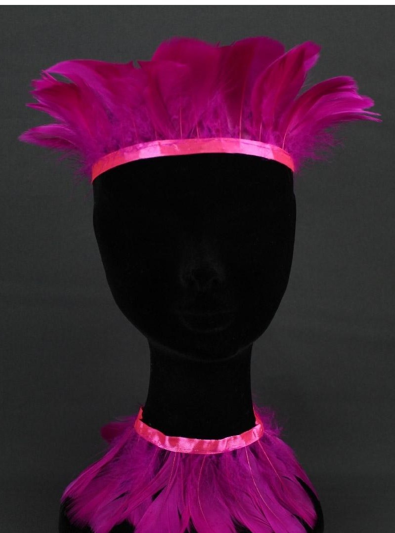 Conjunto cor-de-rosa de penas com faixa de cabeça e colar em manequim negro