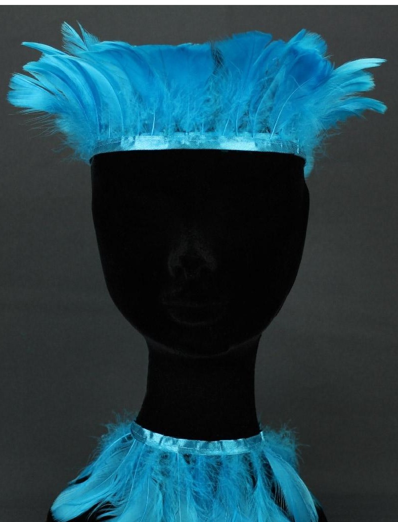 Diadema e colar com penas azuis em manequim branco