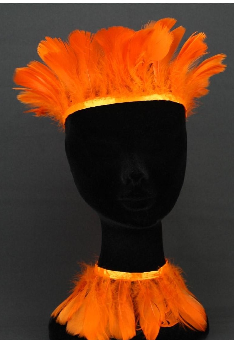 Acessórios com penas laranja fluorescente em manequim preto