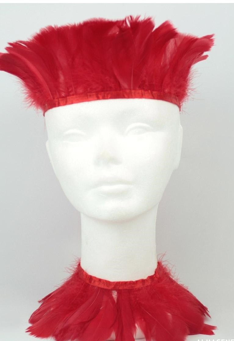 Conjunto fantasia com penas vermelhas na cabeça e no pescoço