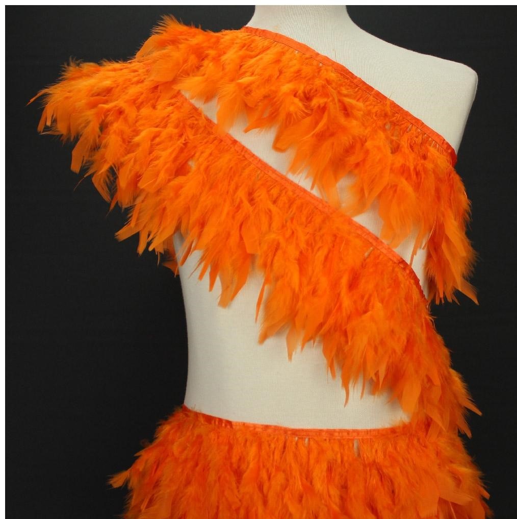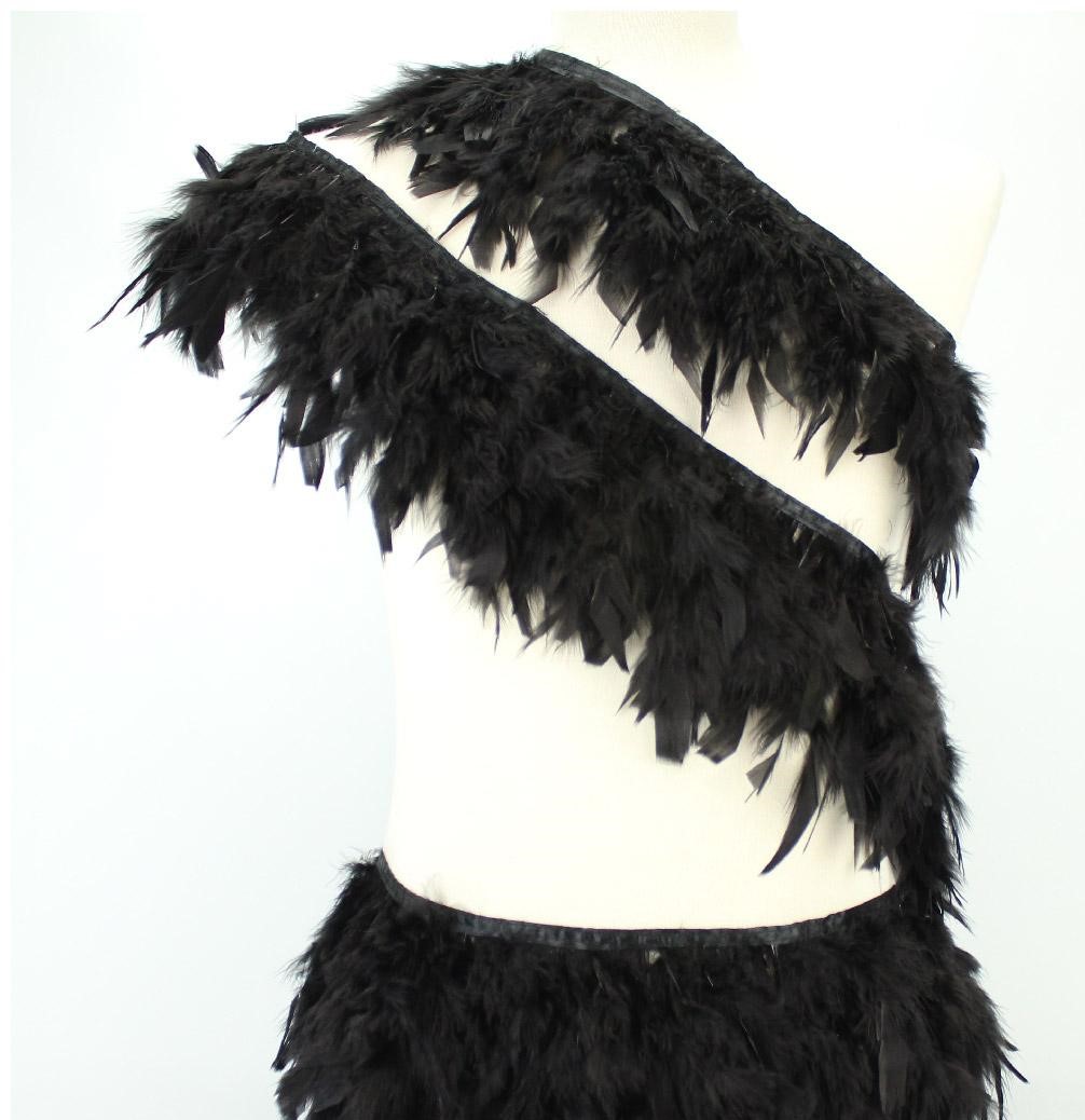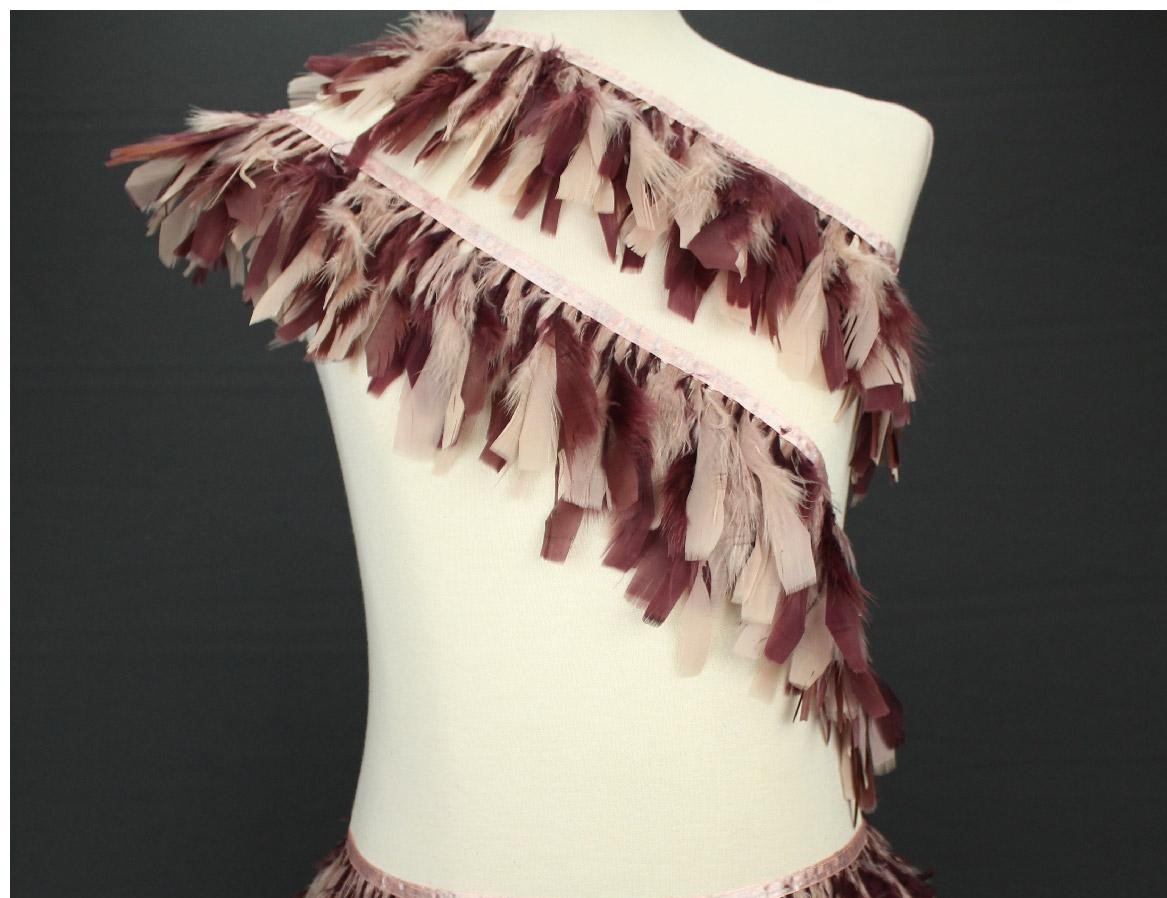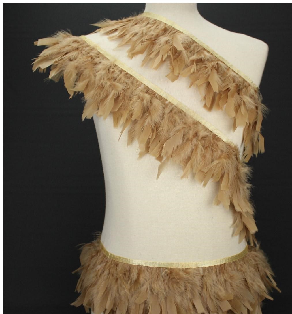 Faixa decorativa de plumas castanhas e bege num manequim branco