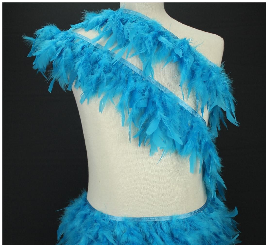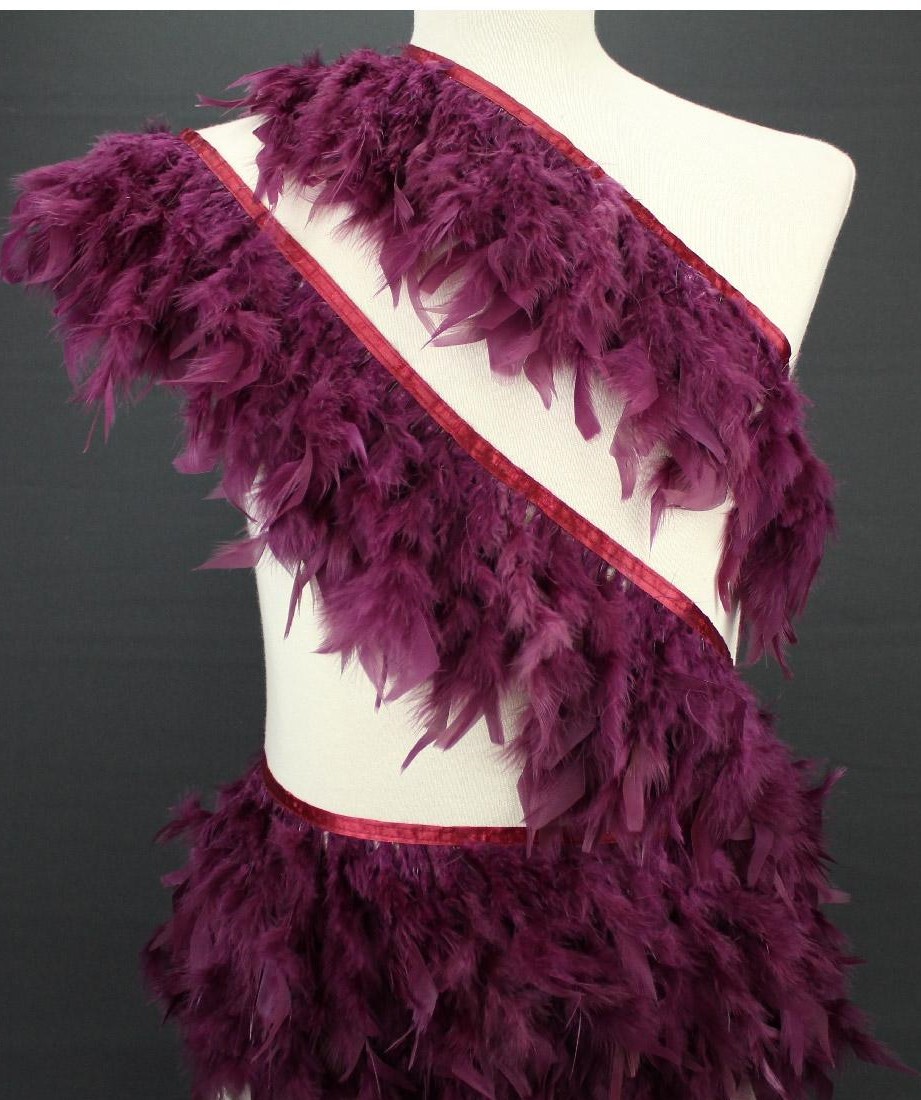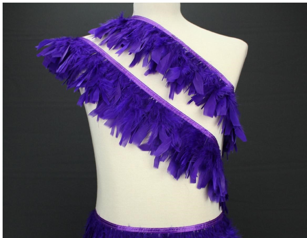 tira decorativa lilás de penas sintéticas sobre manequim branco