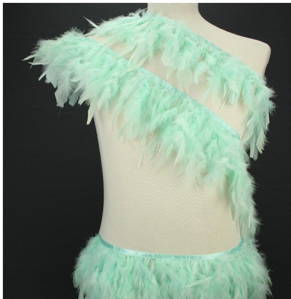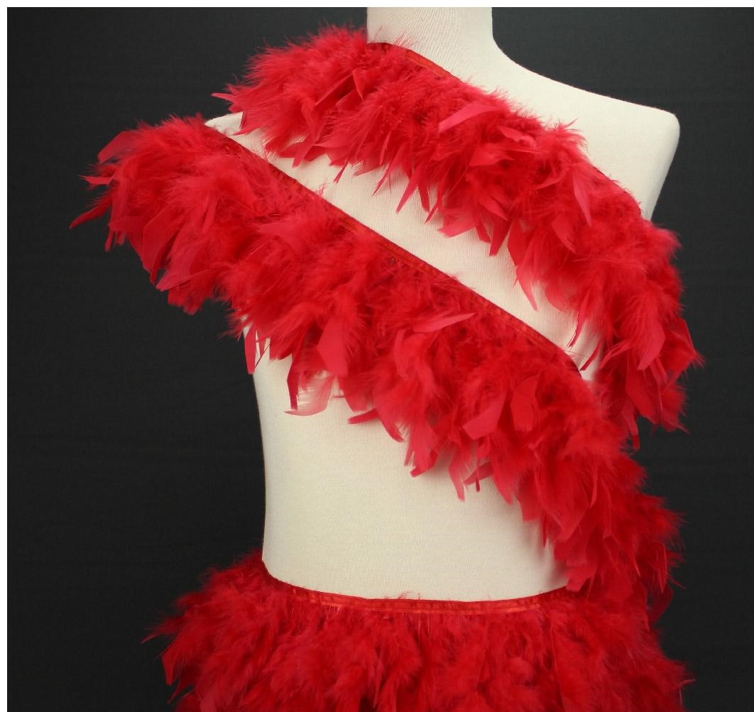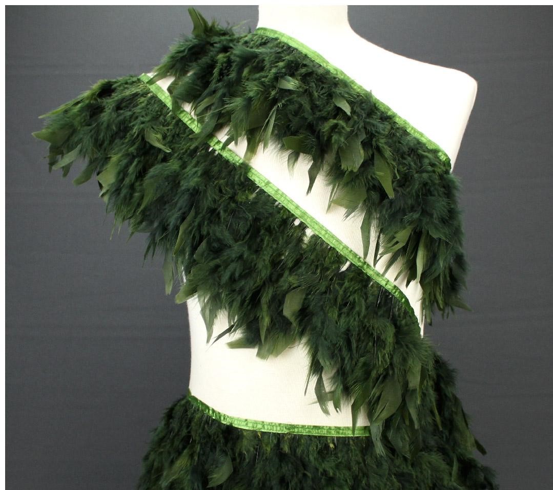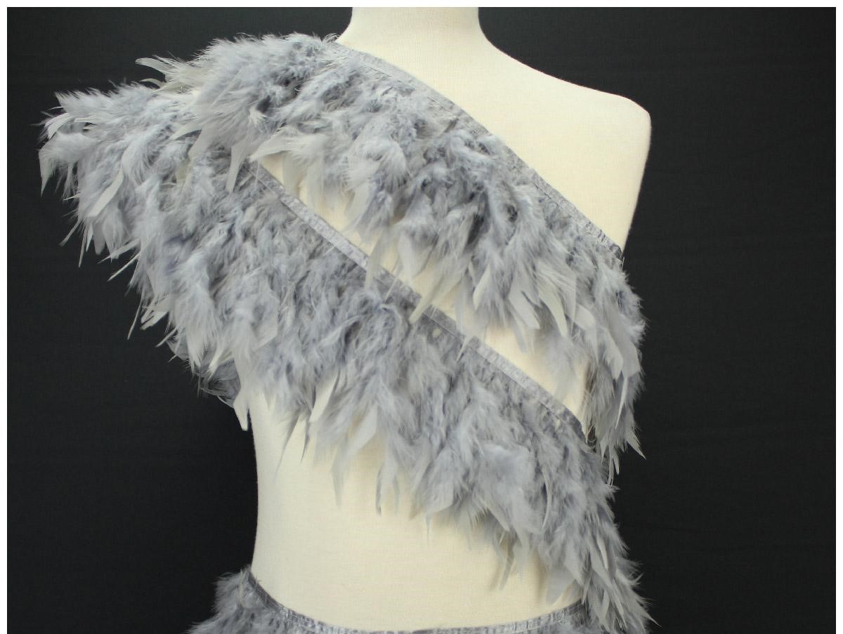 tira decorativa lilás de penas sintéticas sobre manequim branco