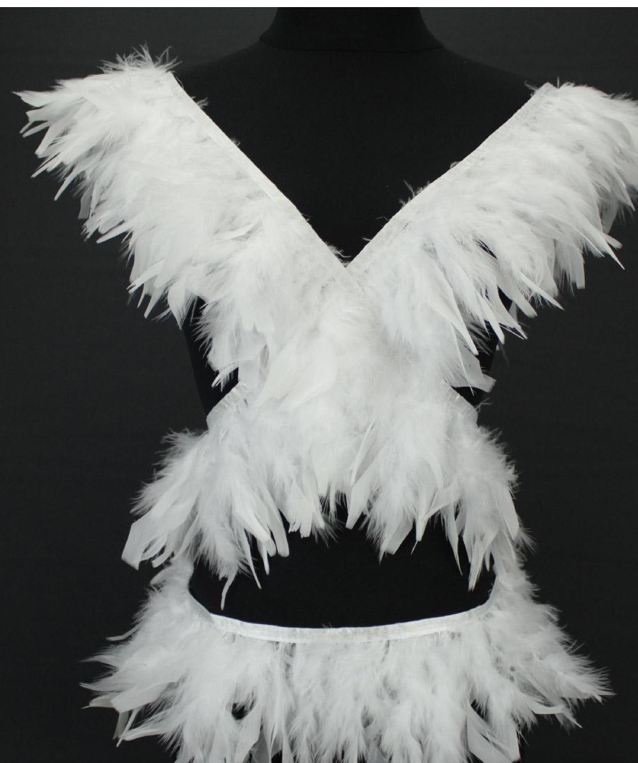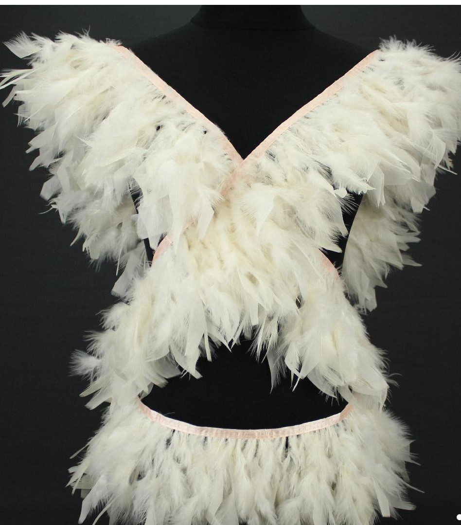 Colete decorativo de penas brancas com detalhes em fita cor-de-rosa