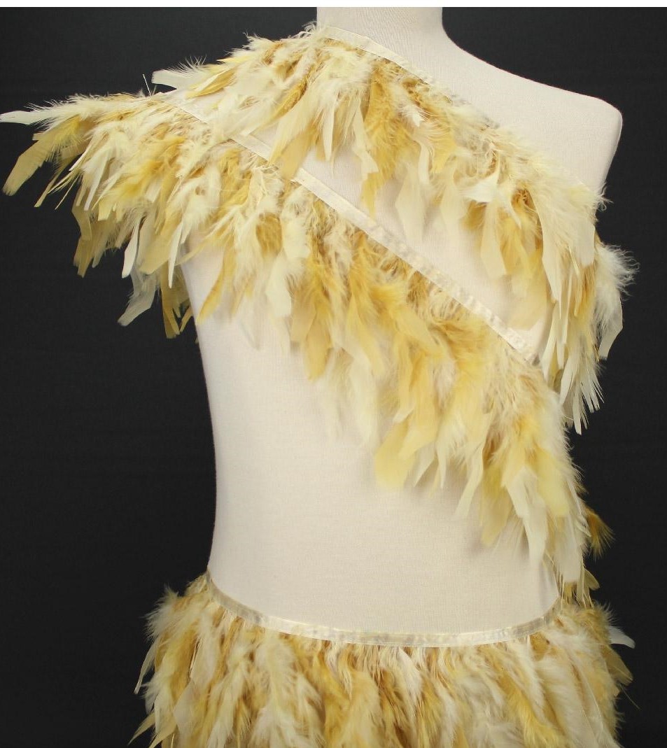 Veste e saia com penas amarelas e bege sobre manequim branco