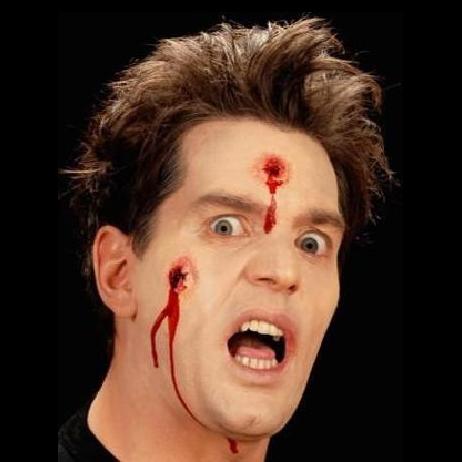 Rosto de homem com feridas falsas tipo bala e expressão de choque