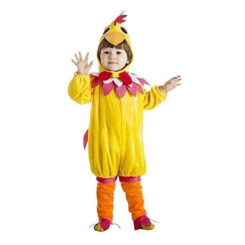 Fato de carnaval infantil amarelo com capuz de aves e detalhes vermelhos e laranja