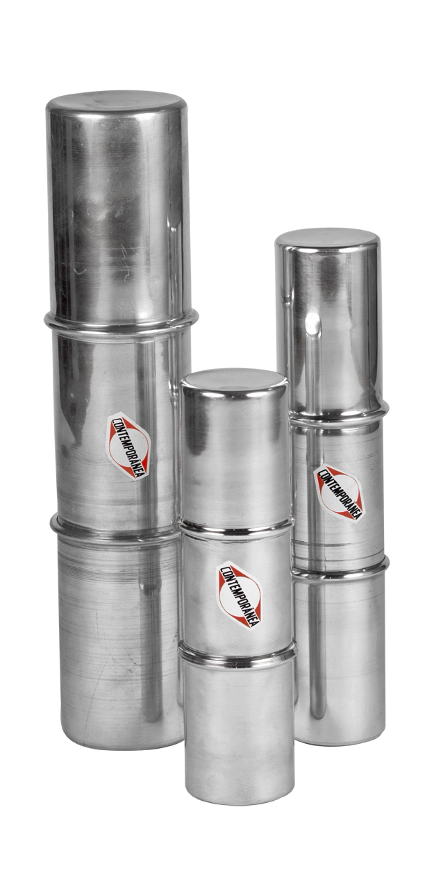 Três tubos metálicos cilíndricos prateados com etiquetas CONTEKPOWER