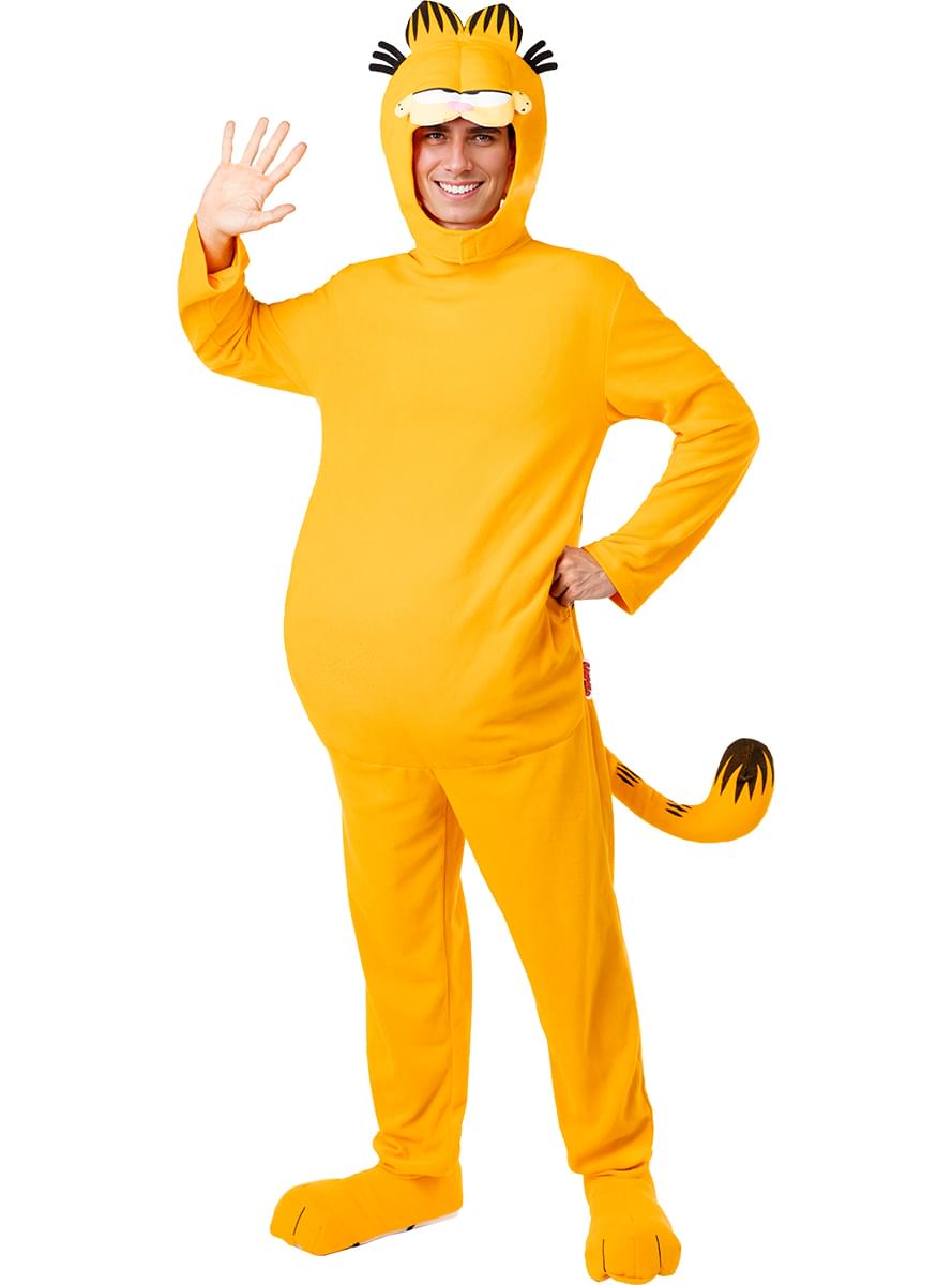 Pessoa com fato amarelo de gato com cauda e capuz com rosto de gato.