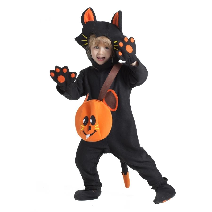 Criança com fato de gato preto e bolsa laranja com rosto de rato