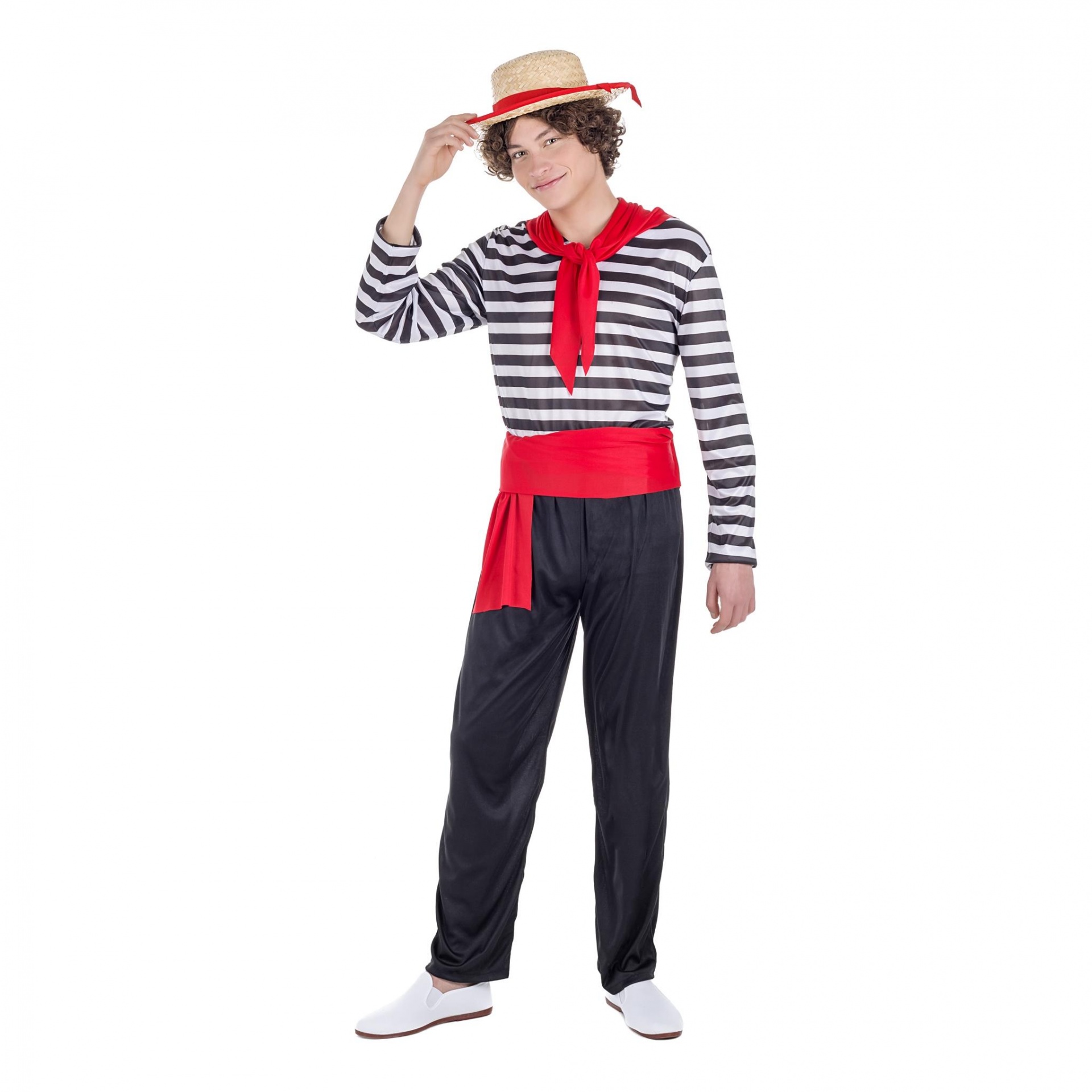 Fantasia de marinheiro com camisa listrada, calças pretas, faixa e lenço vermelhos e chapéu de palha com fita vermelha