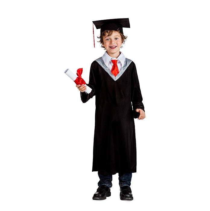 Menino em traje de graduação infantil com beca preta, gravata vermelha e capelo preto