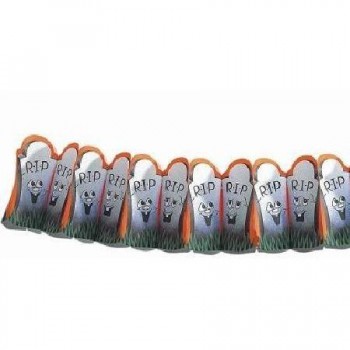 Guirlanda de lápides decorativas cinzentas com texto RIP e rostos assustadores