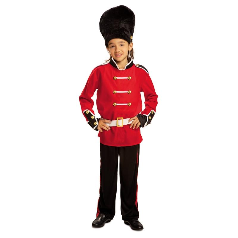 Criança com traje de soldado da guarda real com casaco vermelho, calças pretas e chapéu preto