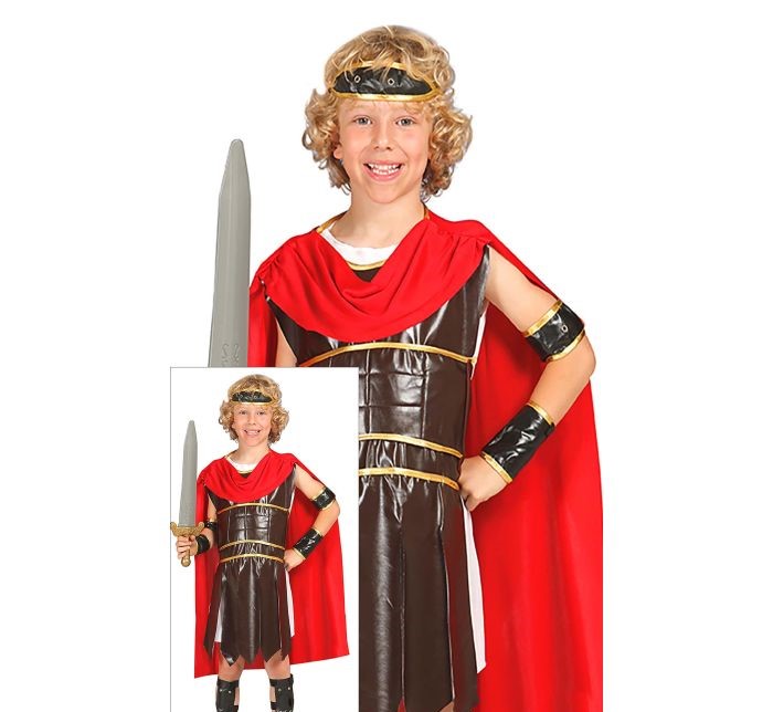 Criança com fantasia romana castanha e vermelha com espada cinza