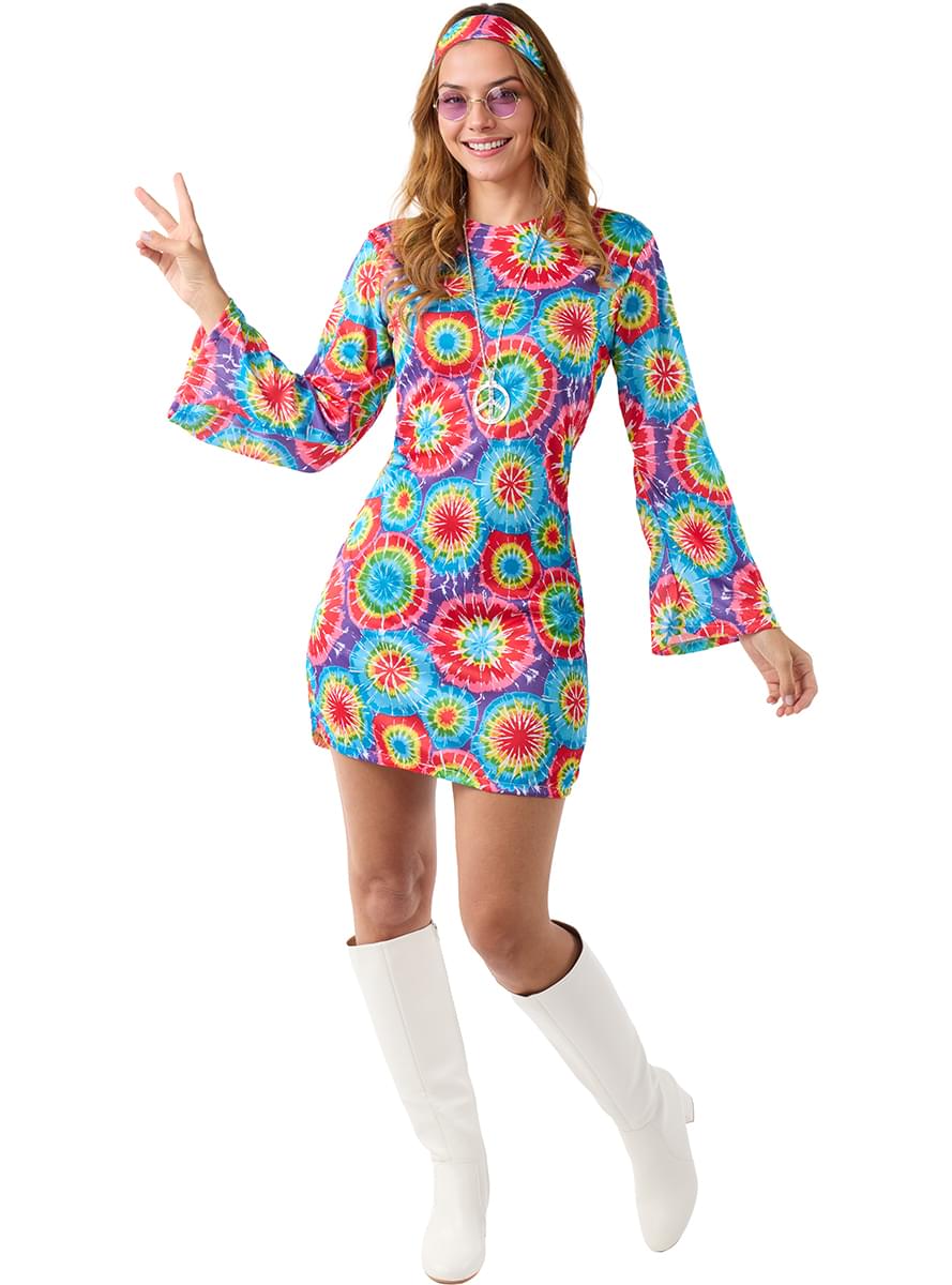 Vestido curto tie-dye colorido com faixa para cabeça e botas brancas