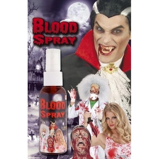 Frasco de spray Blood Spray com personagens de Halloween ao fundo.