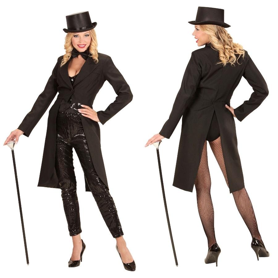 Casaco fraque preto feminino com chapéu de cartola e bengala.