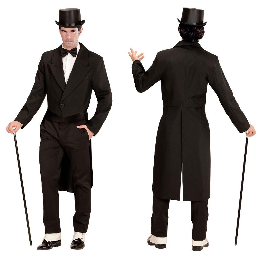 Homem com fato clássico preto e chapéu coco, segurando bengala, visto de frente e de costas