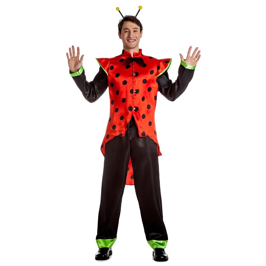 Fato de joaninha vermelho e preto com detalhes verdes para homem