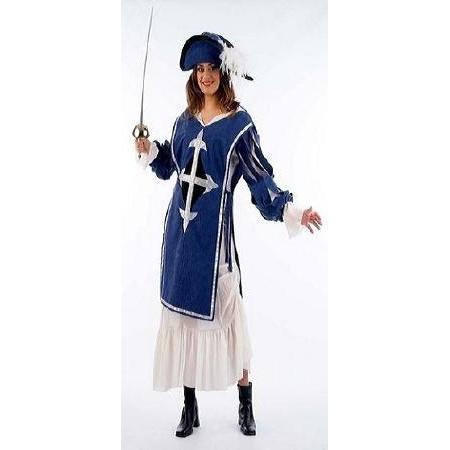 Fato de mosqueteiro azul com saia branca e chapéu com penas