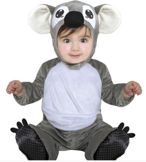 Criança com fato de peluche de animal cinzento e branco com capuz e pés antiderrapantes.