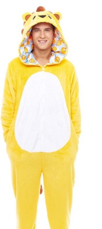 Homem com fato amarelo de leão com capuz e padrão colorido no interior