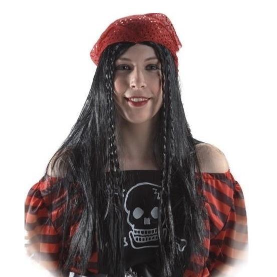 Mulher com fantasia de pirata com camisola de caveira, blusa vermelha e preta às riscas, e lenço vermelho na cabeça