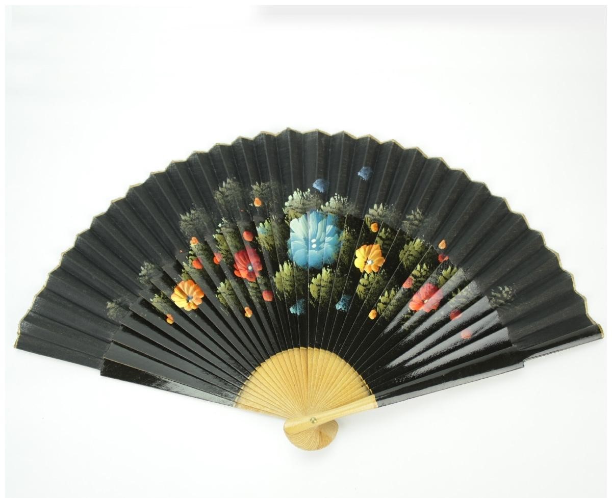 Leque preto com flores coloridas e pega de madeira