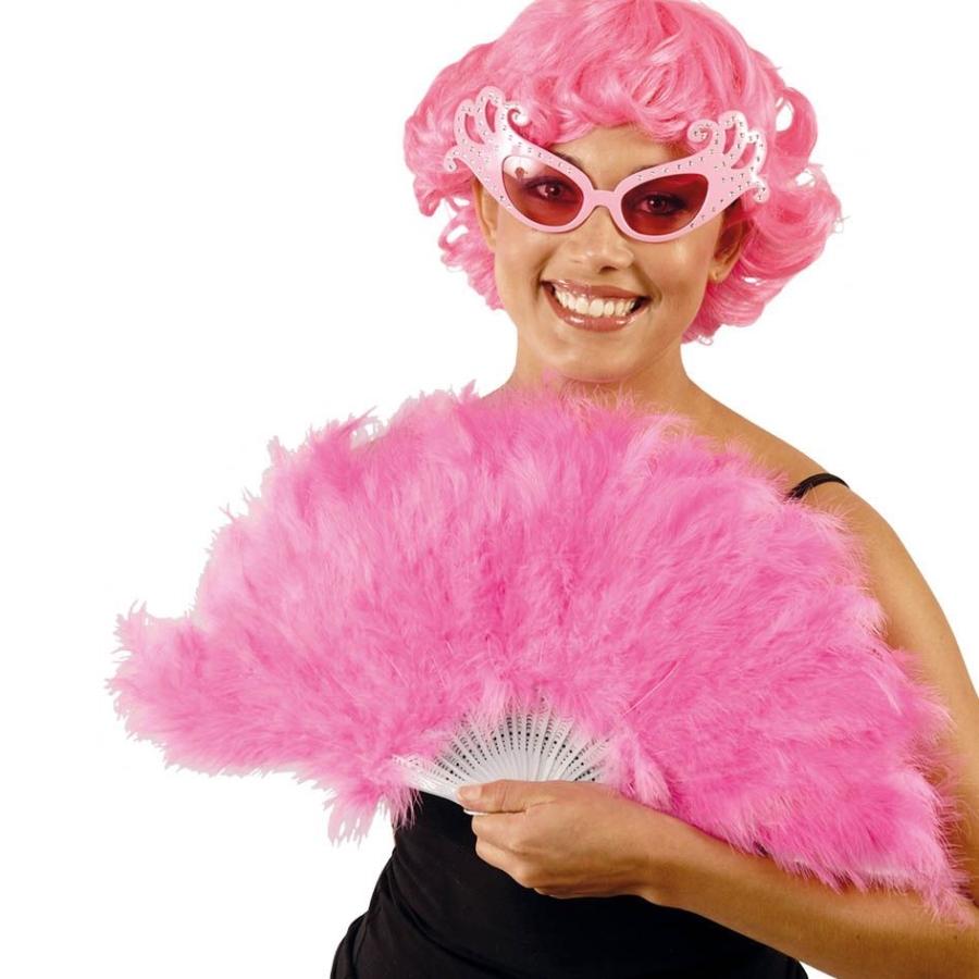 Mulher com peruca rosa, óculos de sol rosa e leque de penas cor-de-rosa