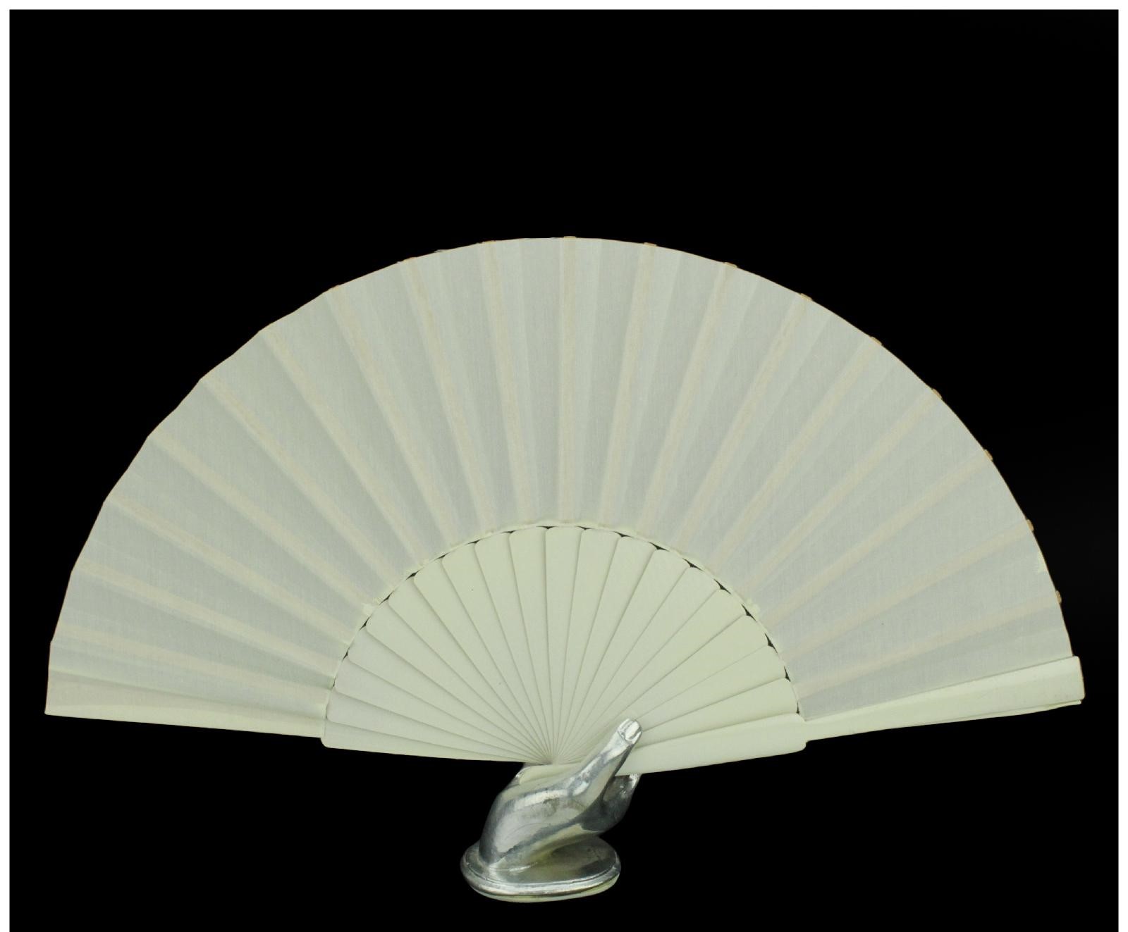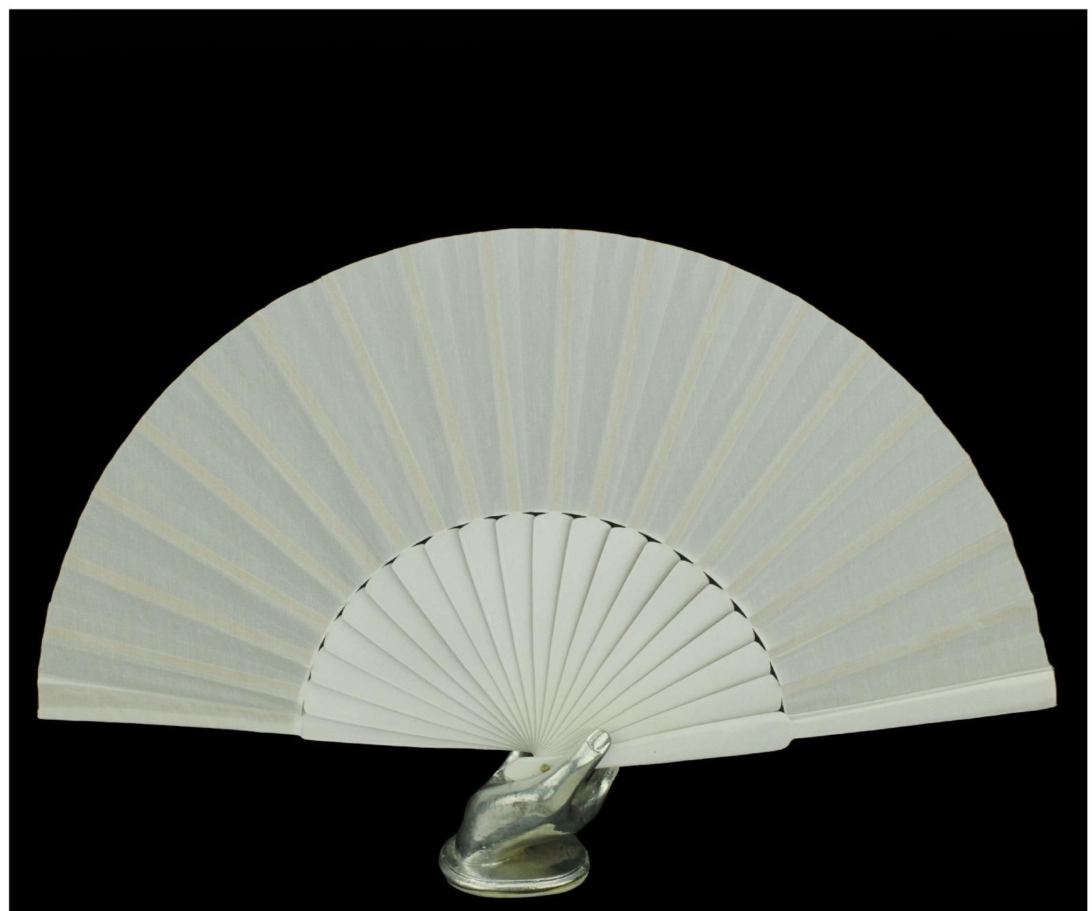 Leque dobrável tecido branco com estrutura clara em mão metálica prateada