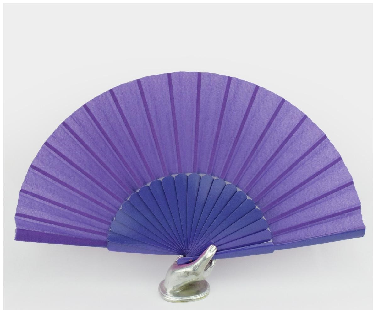 Leque roxo com apoio em forma de mão metálica