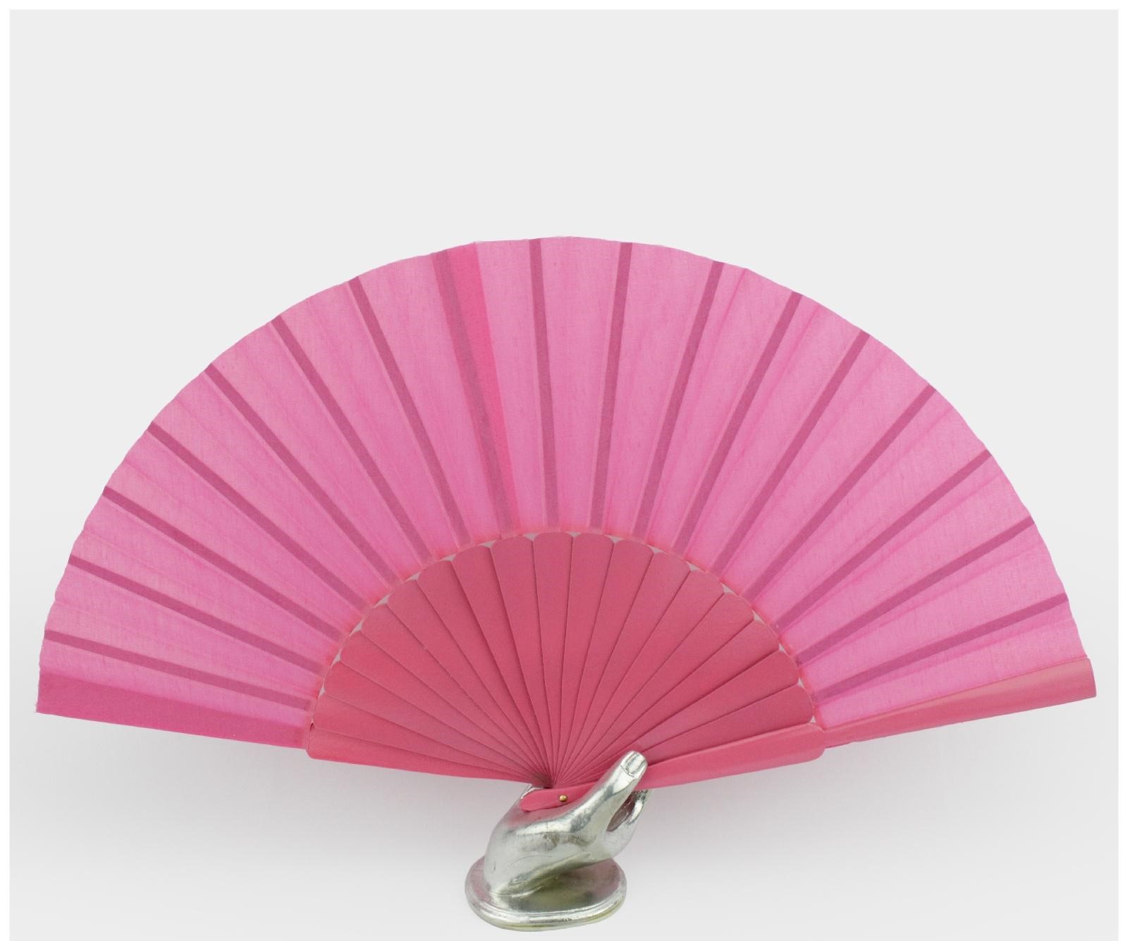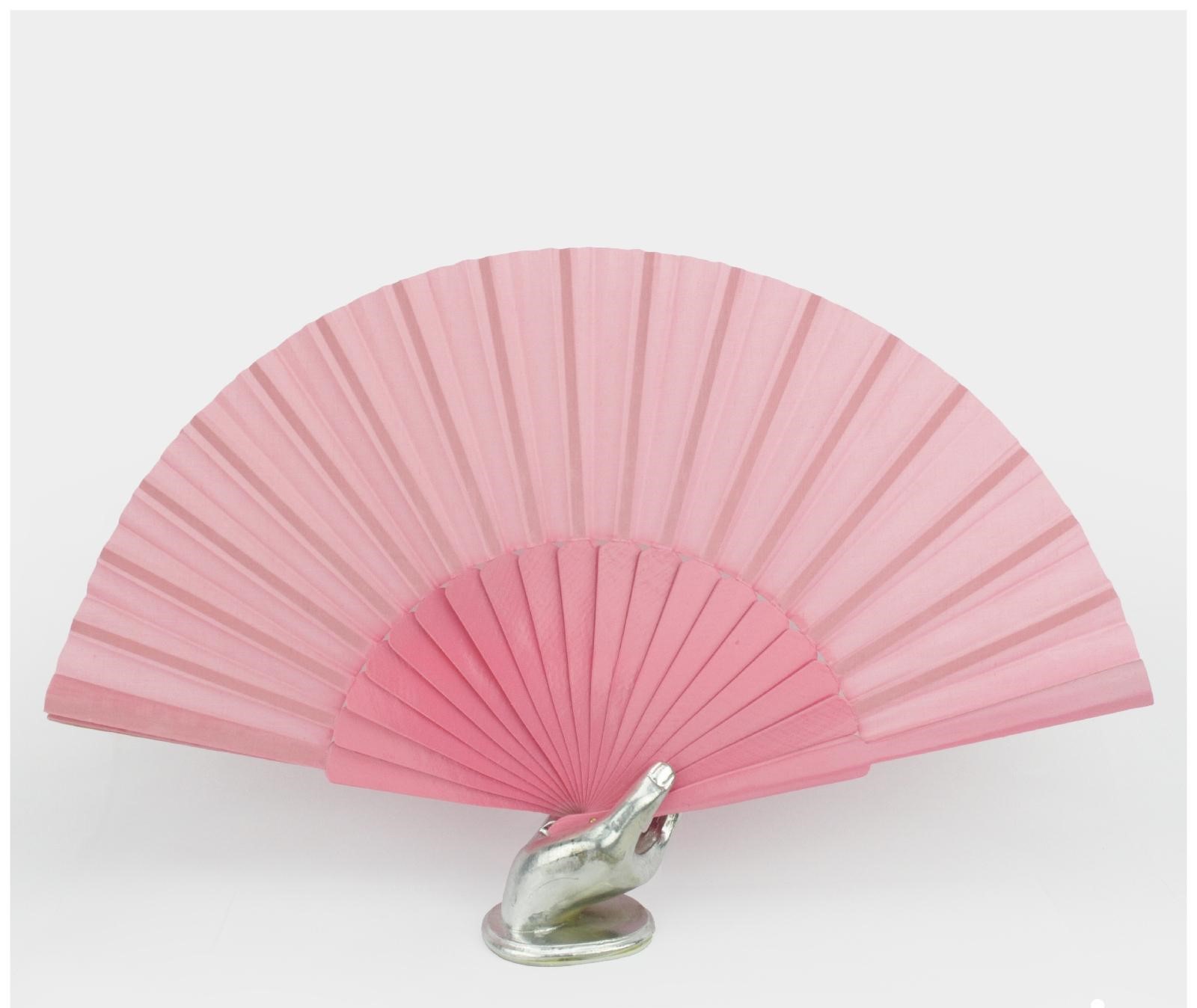 Leque rosa em tecido com base metálica em forma de mão