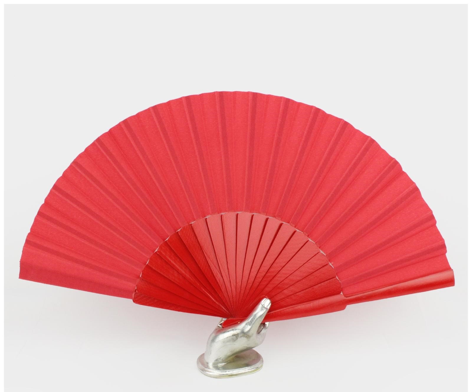 Leque vermelho com armação em madeira e base metálica em forma de mão