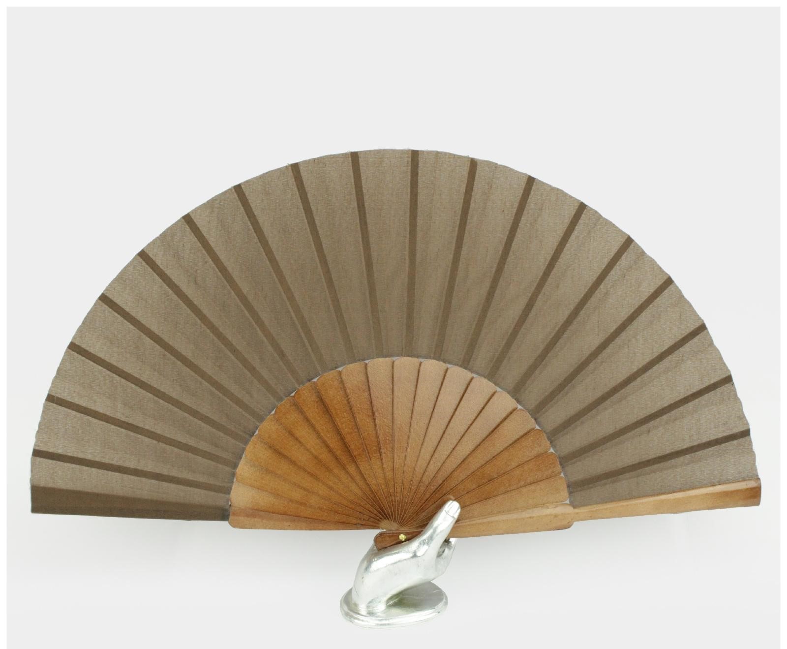 Leque de madeira e tecido castanho com base de mão prateada