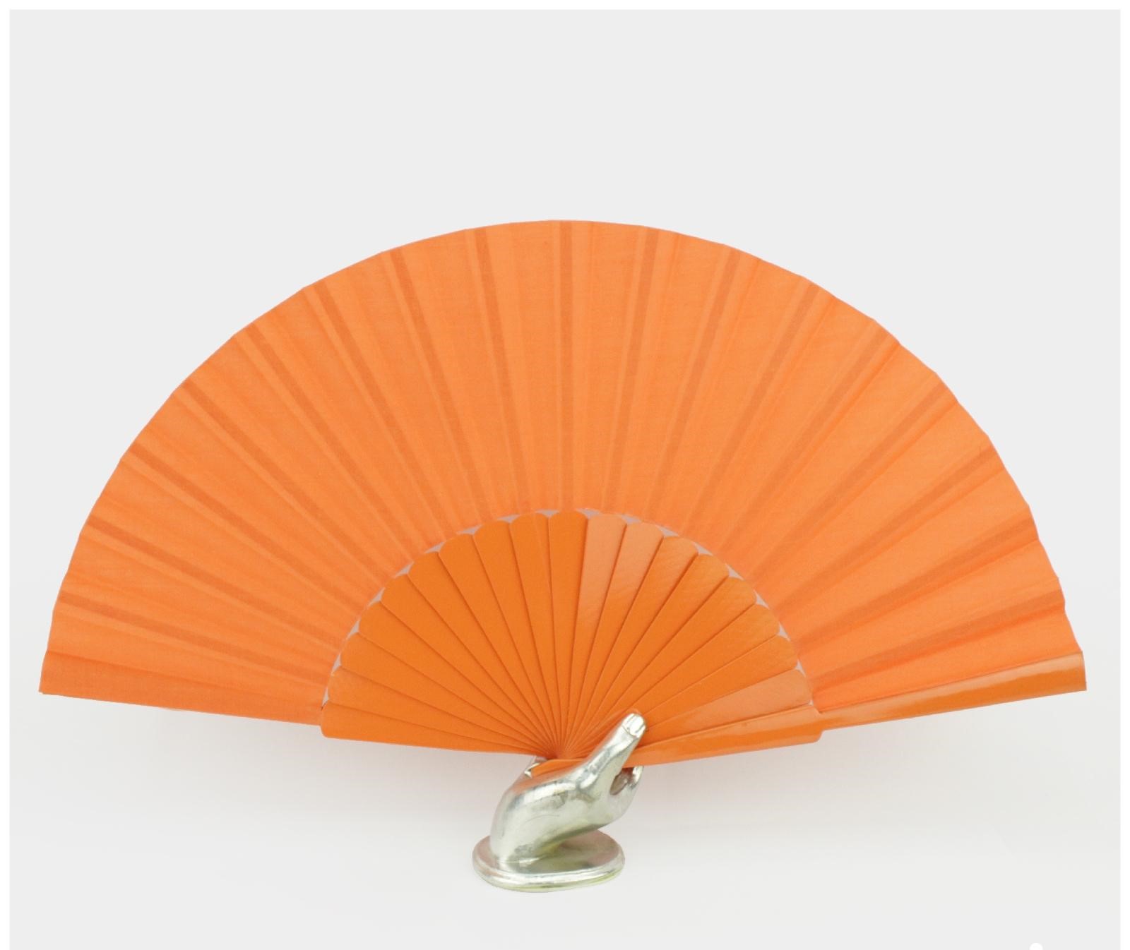 Leque laranja em tecido com varas e suporte em forma de mão