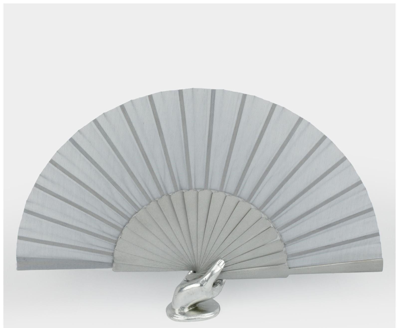 Leque cinzento claro em suporte em forma de mão prateada