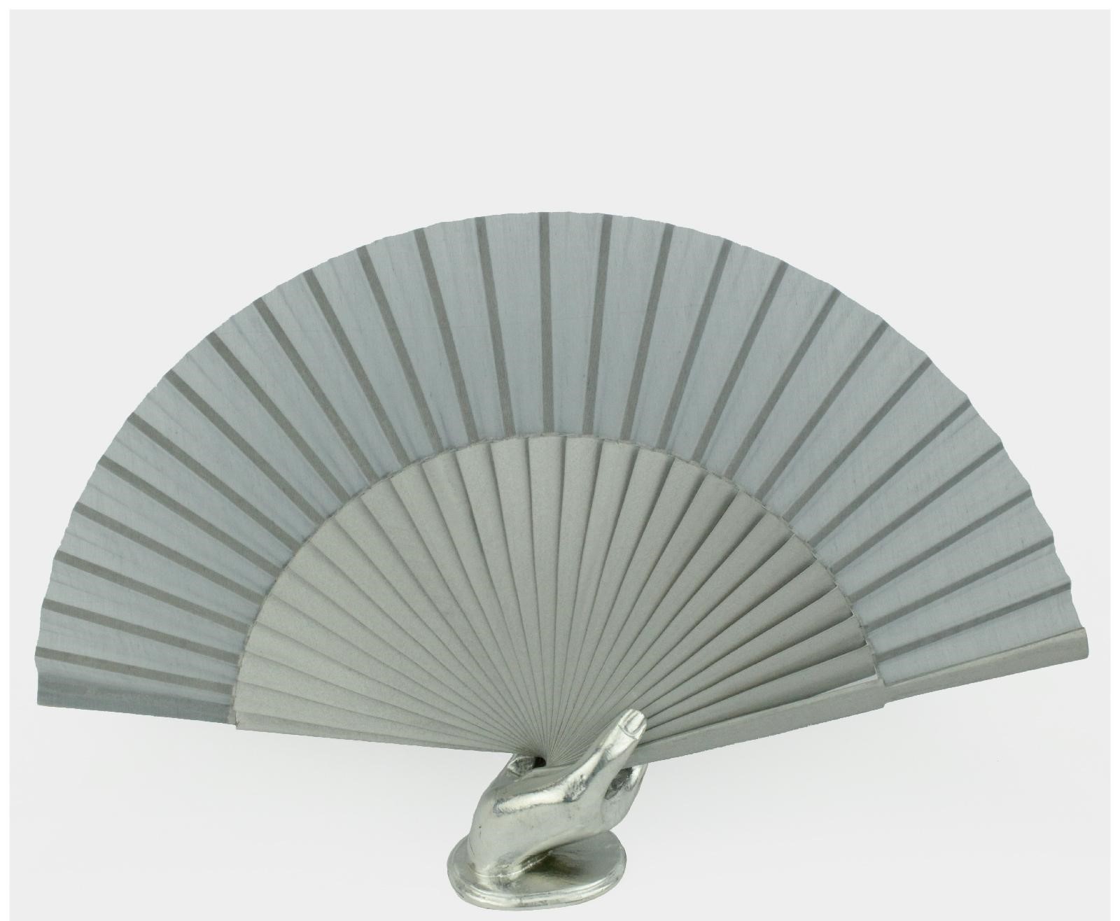 Leque de tecido cinzento com armação de madeira e base de mão prateada