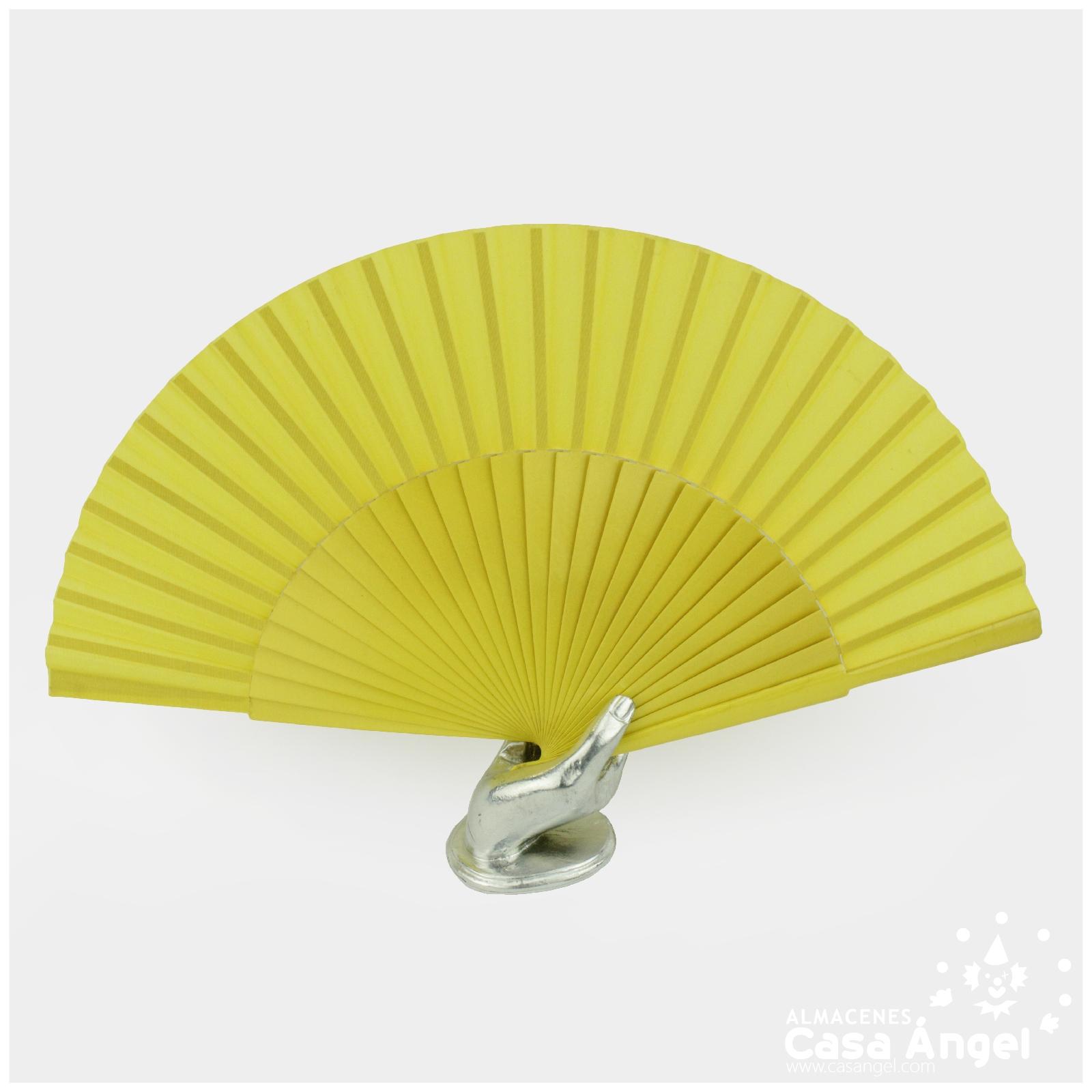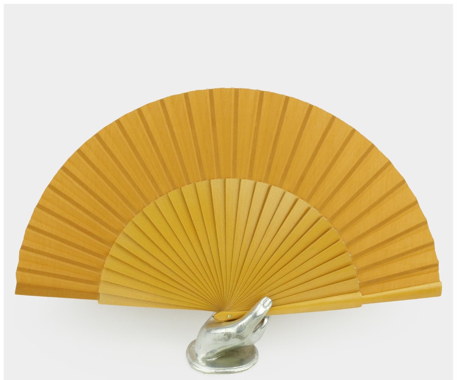 Leque amarelo tradicional em madeira exposto numa base metálica de mão