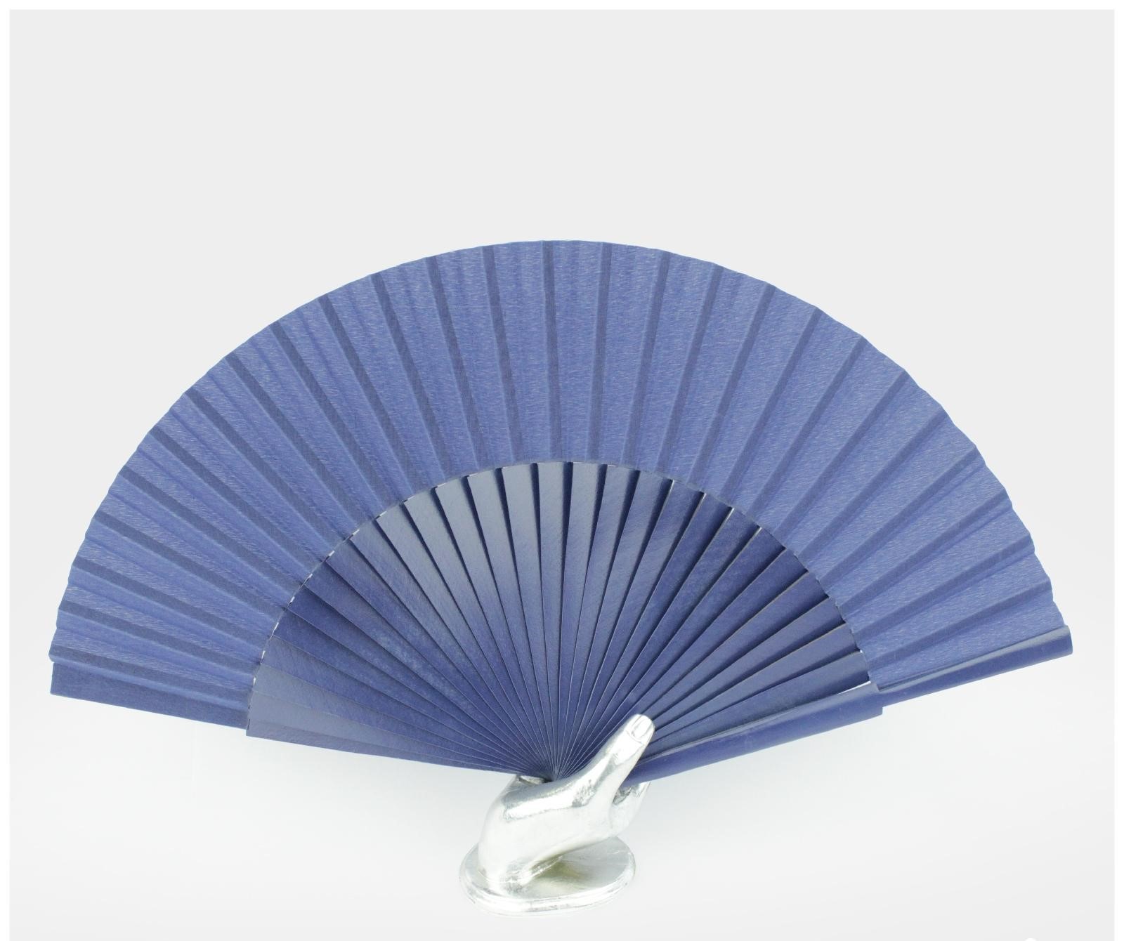 Leque azul de tecido e madeira com base metálica em forma de mão