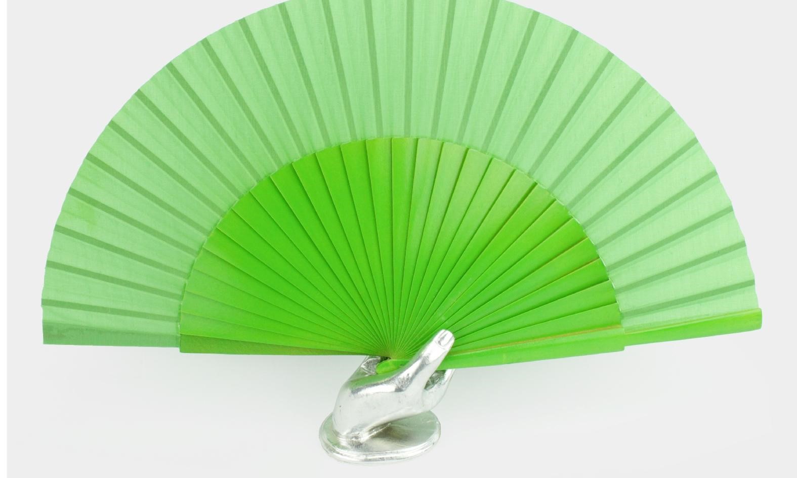 Leque cinzento claro com estrutura em branco, apoiado numa mão prateada